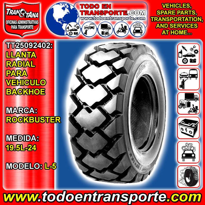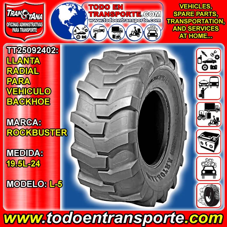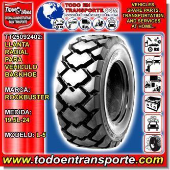 Este producto LLANTA RADIAL PARA VEHICULO BACKHOE MARCA ROCKBUSTER MEDIDA 19.5L-24 MODELO L-5 y muchos mas estan disponibles al por mayor y al detalle en TODOENTRANSPORTE. Pregunta por el codigo TT25092402. Aprovecha grandiosas ofertas todos los dias!